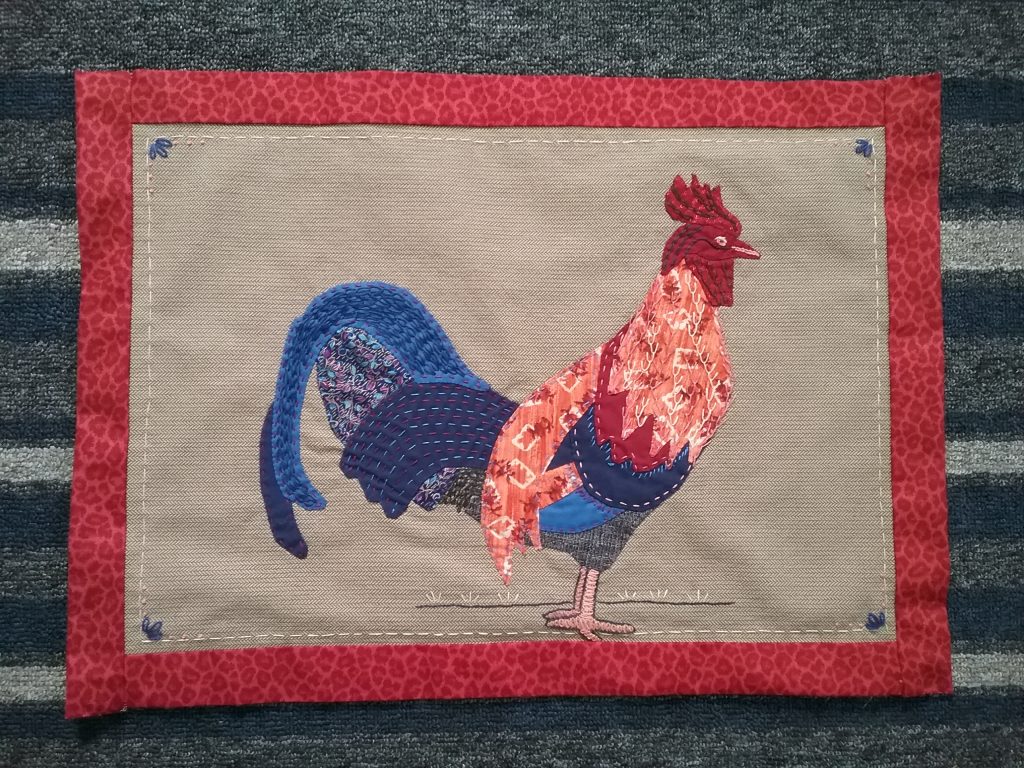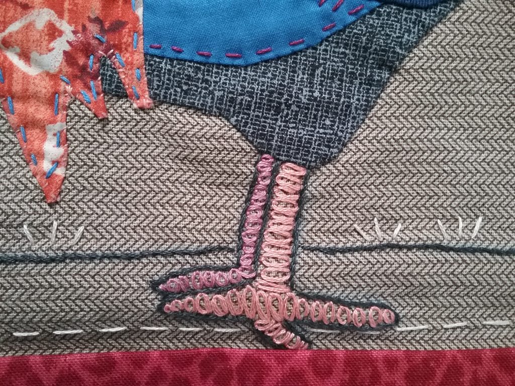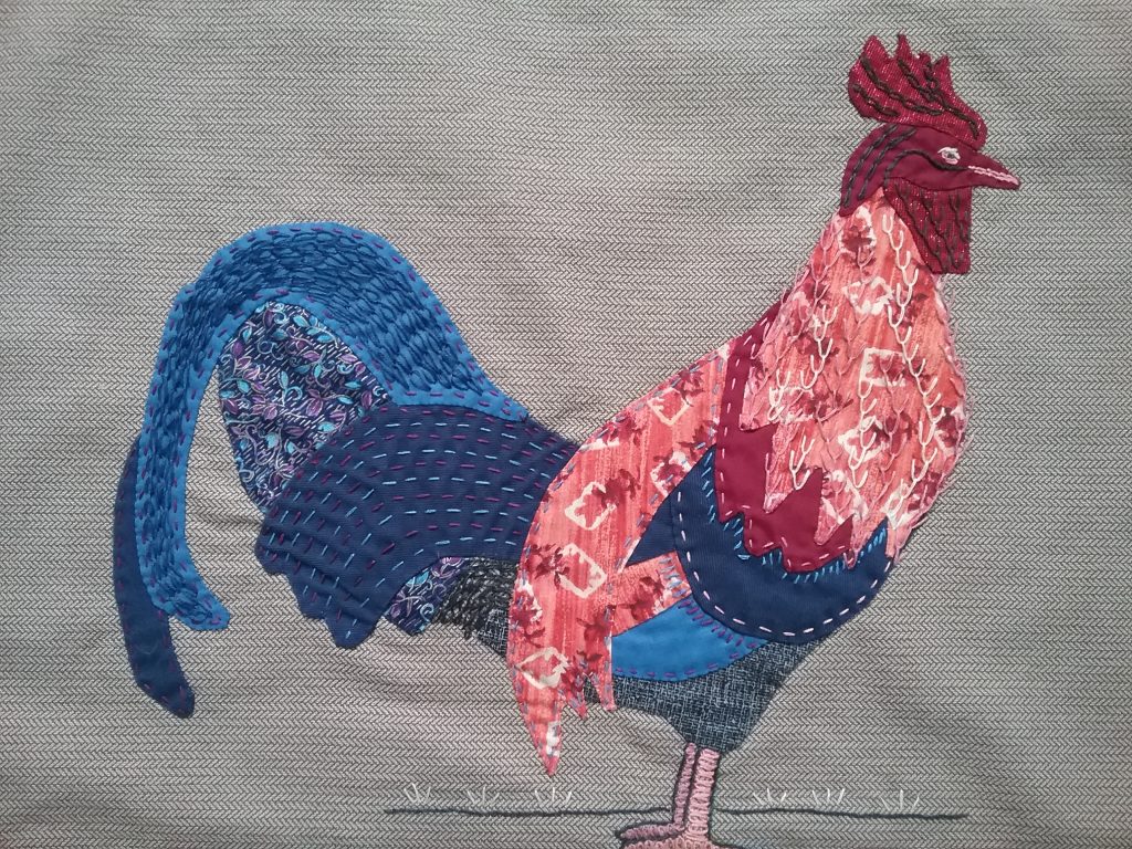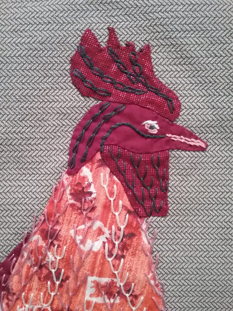 I just finished this rooster wall hanging, which features pieces of fabric hand-appliqued to a background fabric with embroidered stitches to add extra interest. I’m pretty pleased with how it turned out.