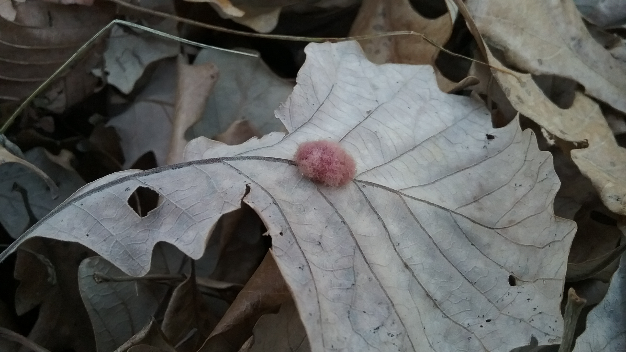 See that pink fuzzy critter in the middle of this dried oak leaf?