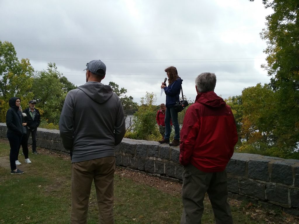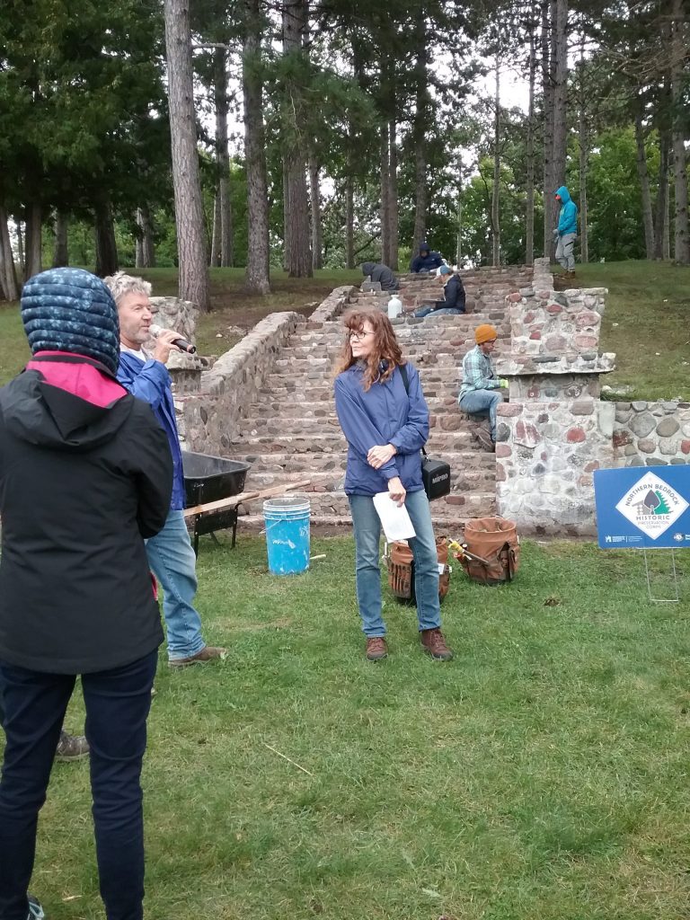 A crew from Northern Bedrock Preservation Corps, led by Fitzie Heimdahl with technical assistance from a local mason, was performing restoration work on the stone staircase and the tour group got an explanation of the work from those involved.