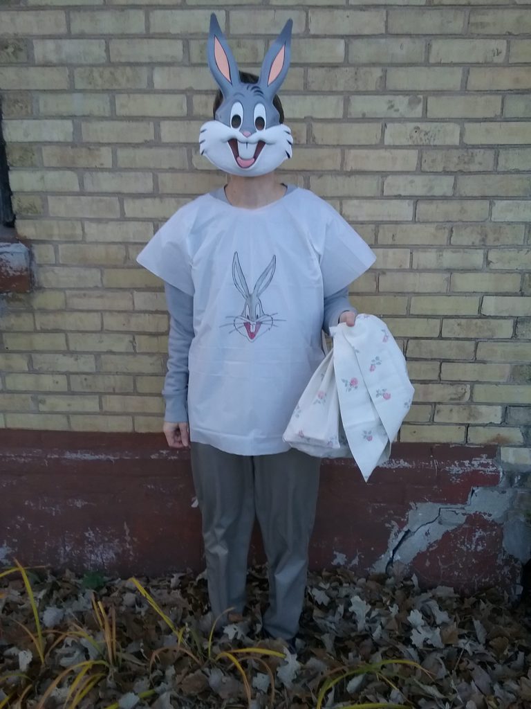 Memory becomes vague over time, so we looked online for photos of these vintage costumes in order to get the look right. The Road Runner costume had green pants and a purple top. Bugs had a white top and blue pants. Both had pictures of their respective characters on the tops, which I find strange. It’d be like me walking around with a picture of myself on my shirt. Apparently, Bugs and Road Runner were navel-gazers. But, I digress.